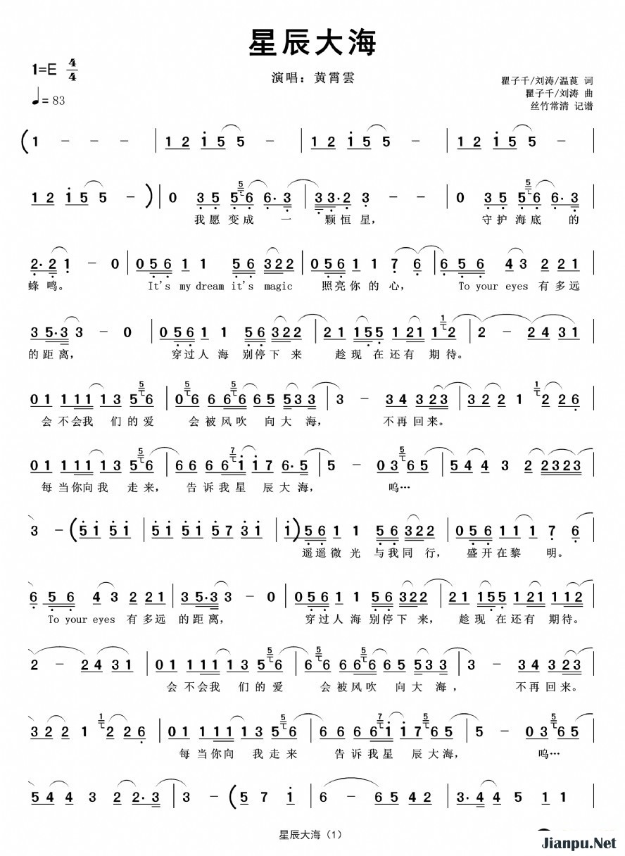 《星辰大海(演唱:黄霄云)》简谱黄霄云原唱 歌谱-简谱之家制谱-钢琴谱