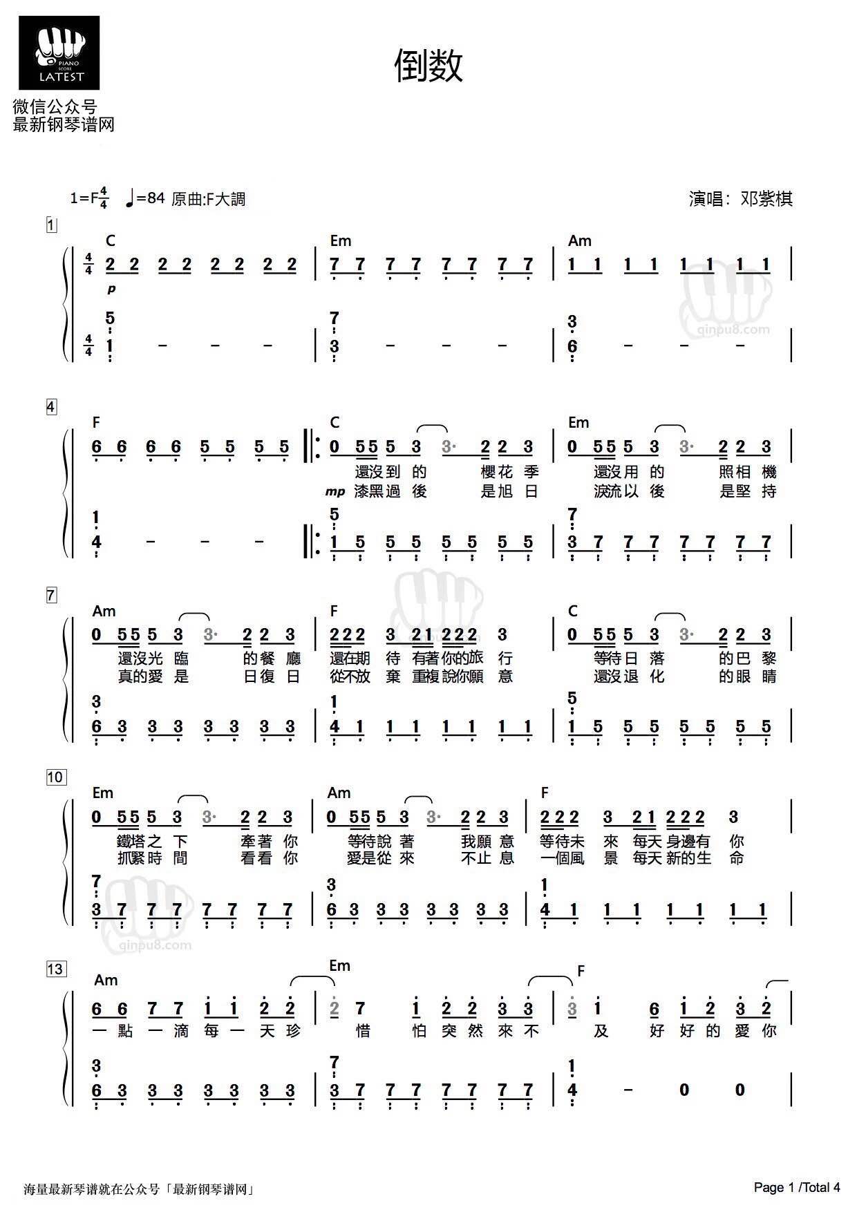 倒数简和谱简谱-邓紫棋演唱-看谱啦