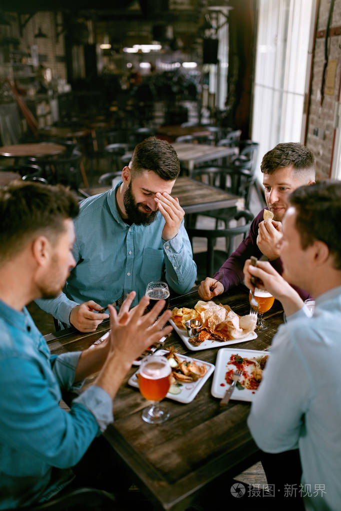 照片 朋友在晚宴上喝啤酒, 在酒吧餐厅吃东西.高分辨率.jpg
