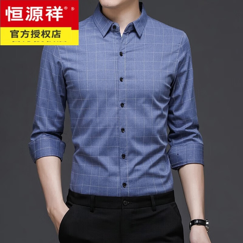 恒源祥薄款长袖衬衫男春秋季竹浆纤维简约轻商务休闲易烫格子衬衣爸爸