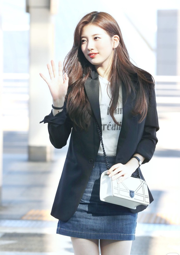 国民初恋的裴秀智黑色西装外套搭配牛仔短裙现身机场特别凉爽