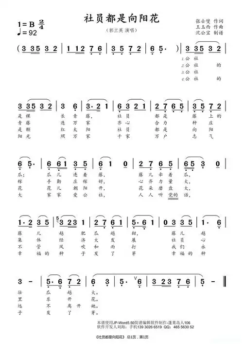 社员都是向阳花_歌谱简谱_哆来咪123曲谱网