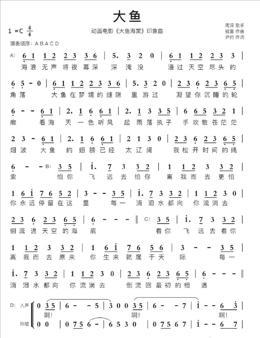 大鱼简谱(歌词)-周深演唱-《大鱼海棠》动画电影印象曲1