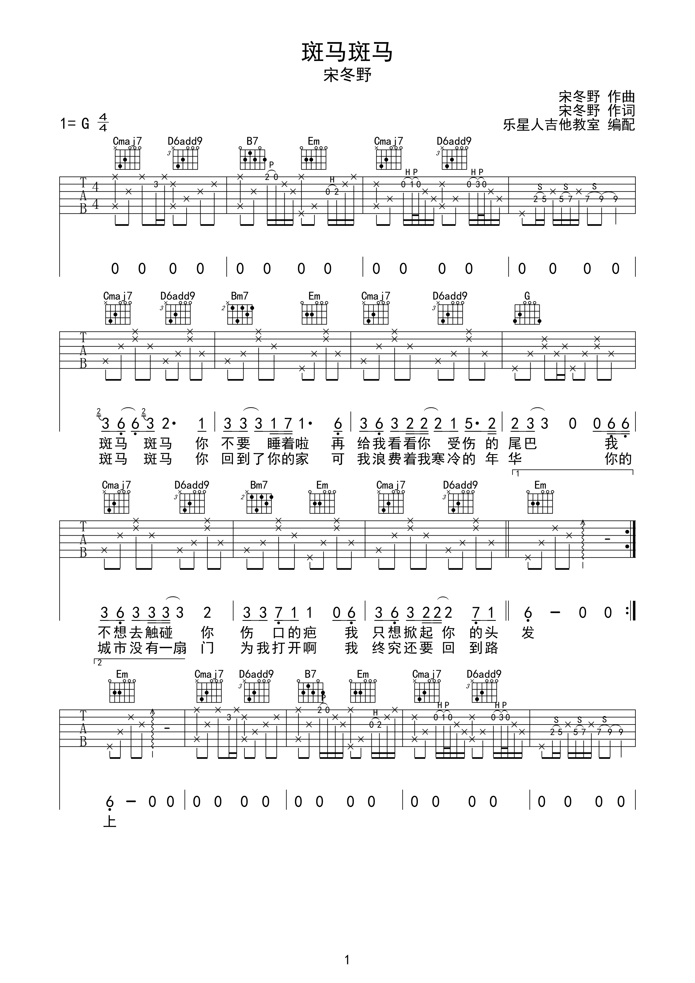 g调简单版宋冬野斑马斑马吉他弹唱六线谱