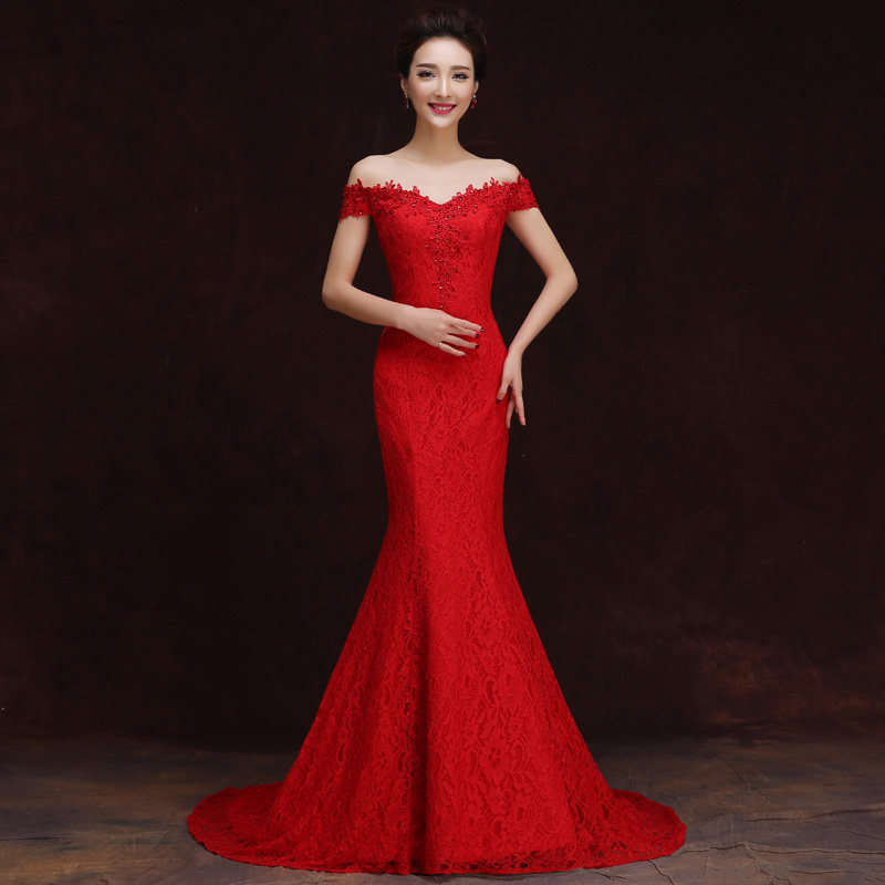 敬酒服新娘时尚2016春新款结婚纱礼服一字肩红色长款宴会晚礼