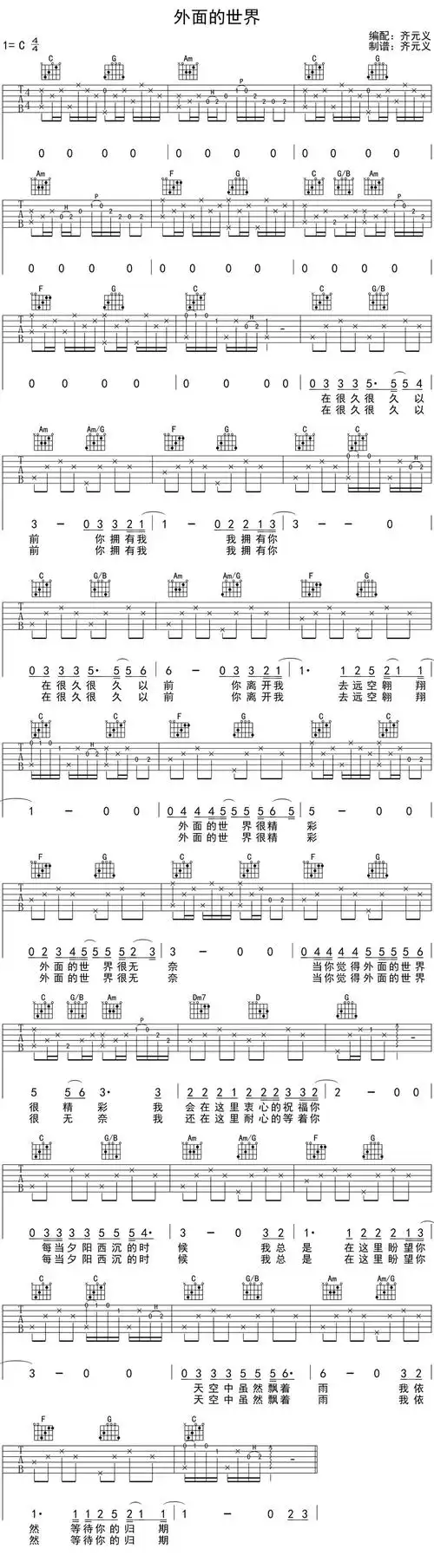 齐秦外面的世界吉他谱c调高清弹唱谱齐元义编配