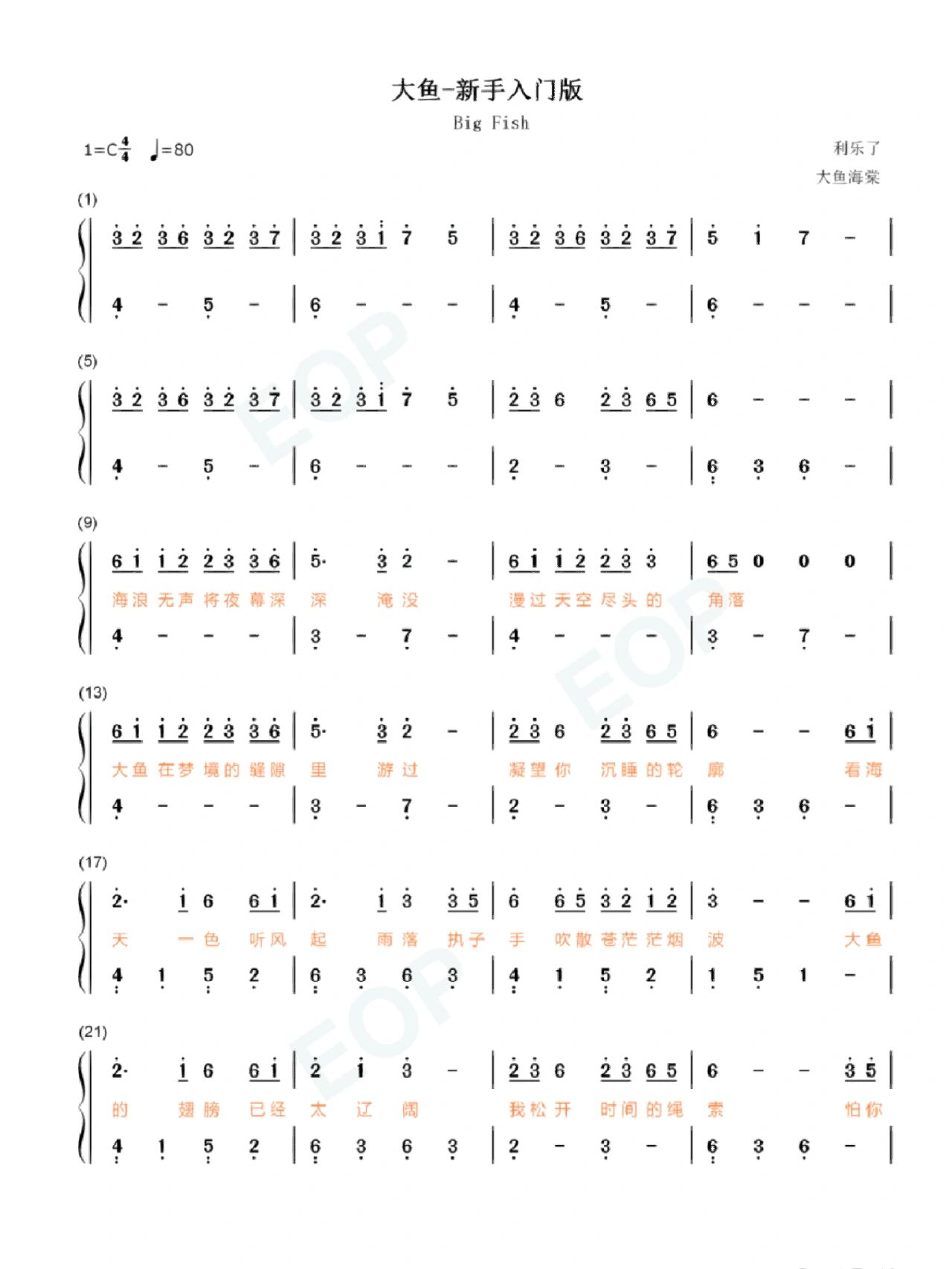 大鱼 带指法 c调 《大鱼海棠》印象曲钢琴谱,[双手简谱] 大鱼 带指法