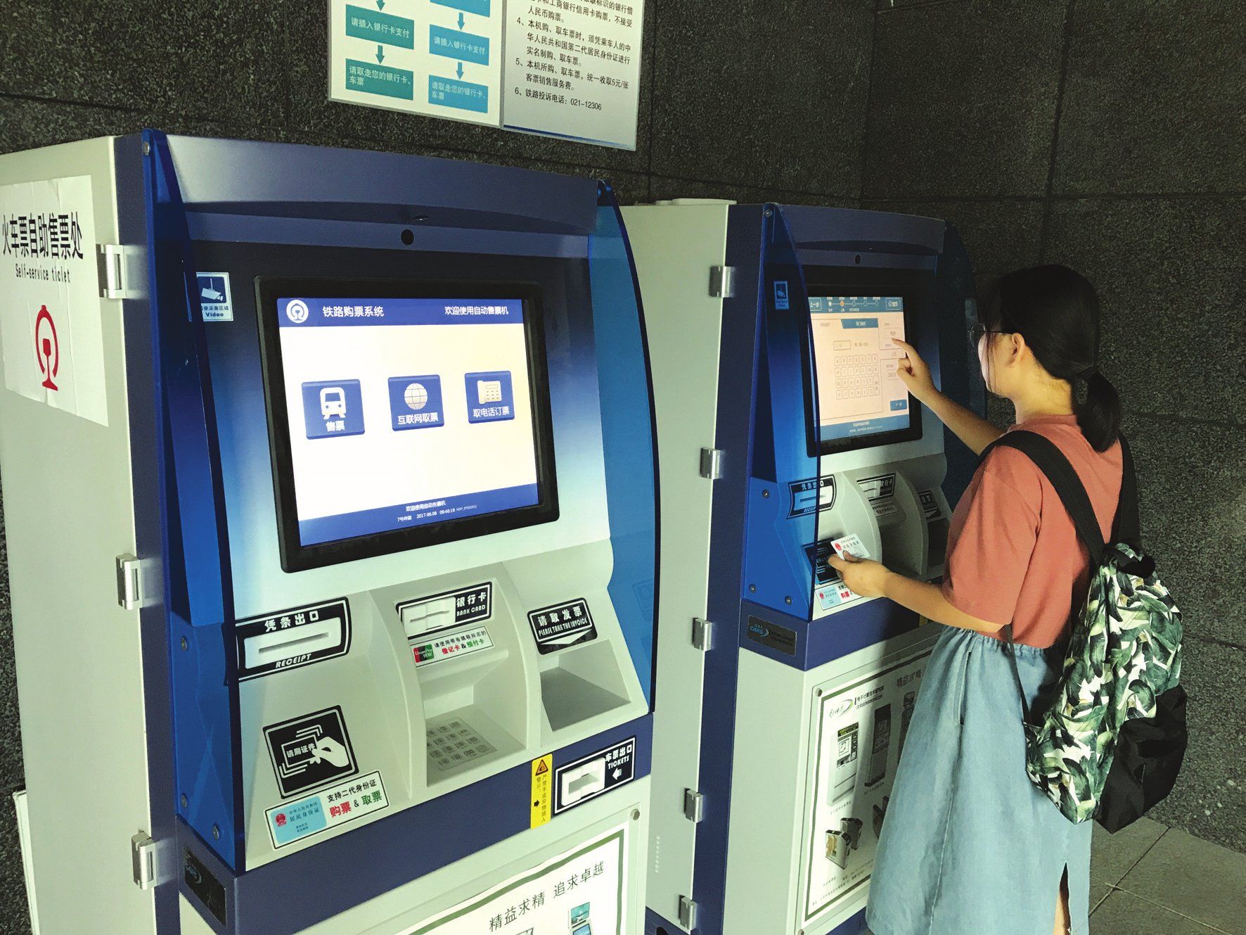 旅客在高铁阜阳西站售票大厅自动售票机上取票.