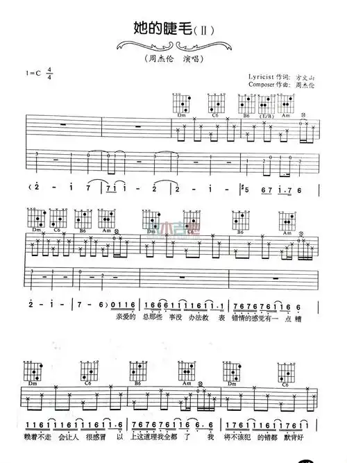 她的睫毛吉他谱_周杰伦_c调弹唱六线谱_弹手吉他上传