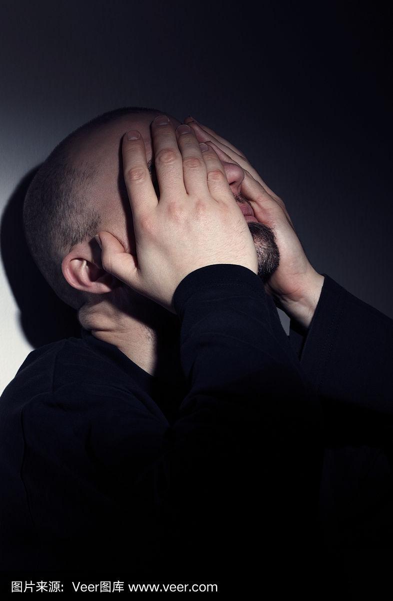 人在绝望中哭泣, 双手捂着脸, 低调的肖像照片