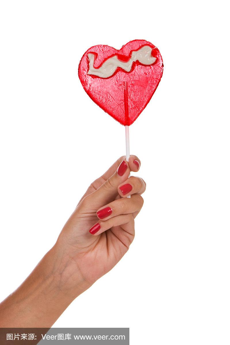 手里拿着心形棒棒糖