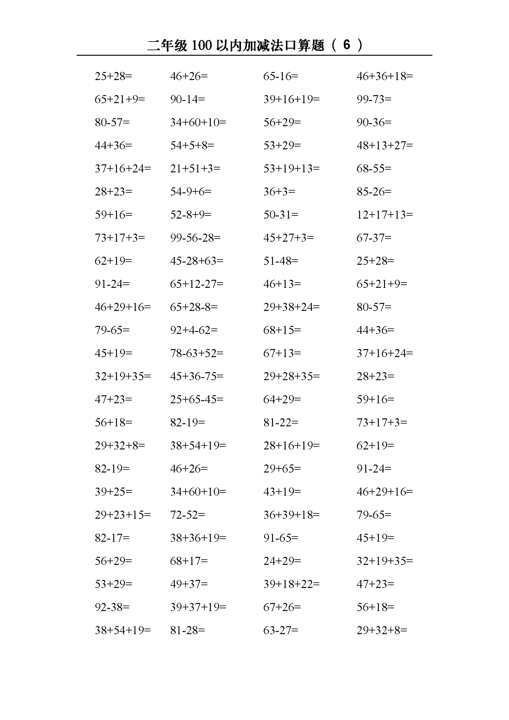 小学数学二年级100以内加减法口算题600道