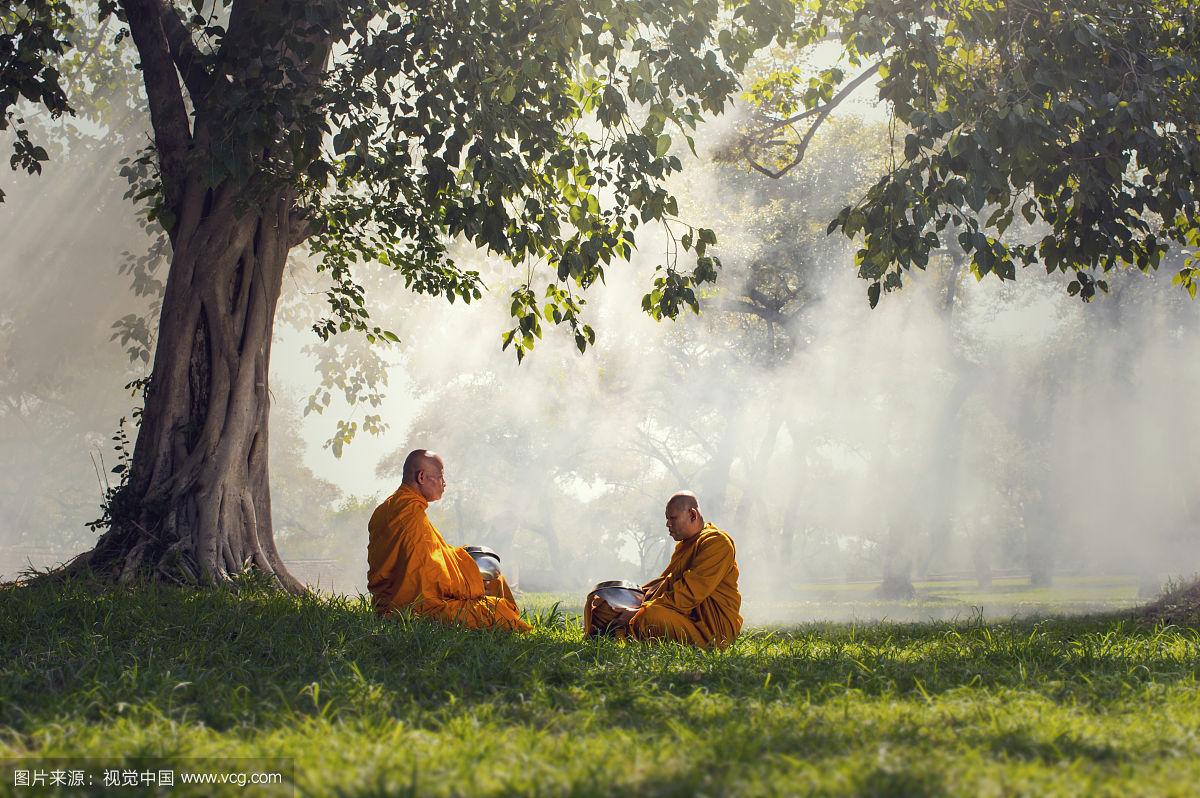 两个和尚在树下冥想与阳光,佛宗法