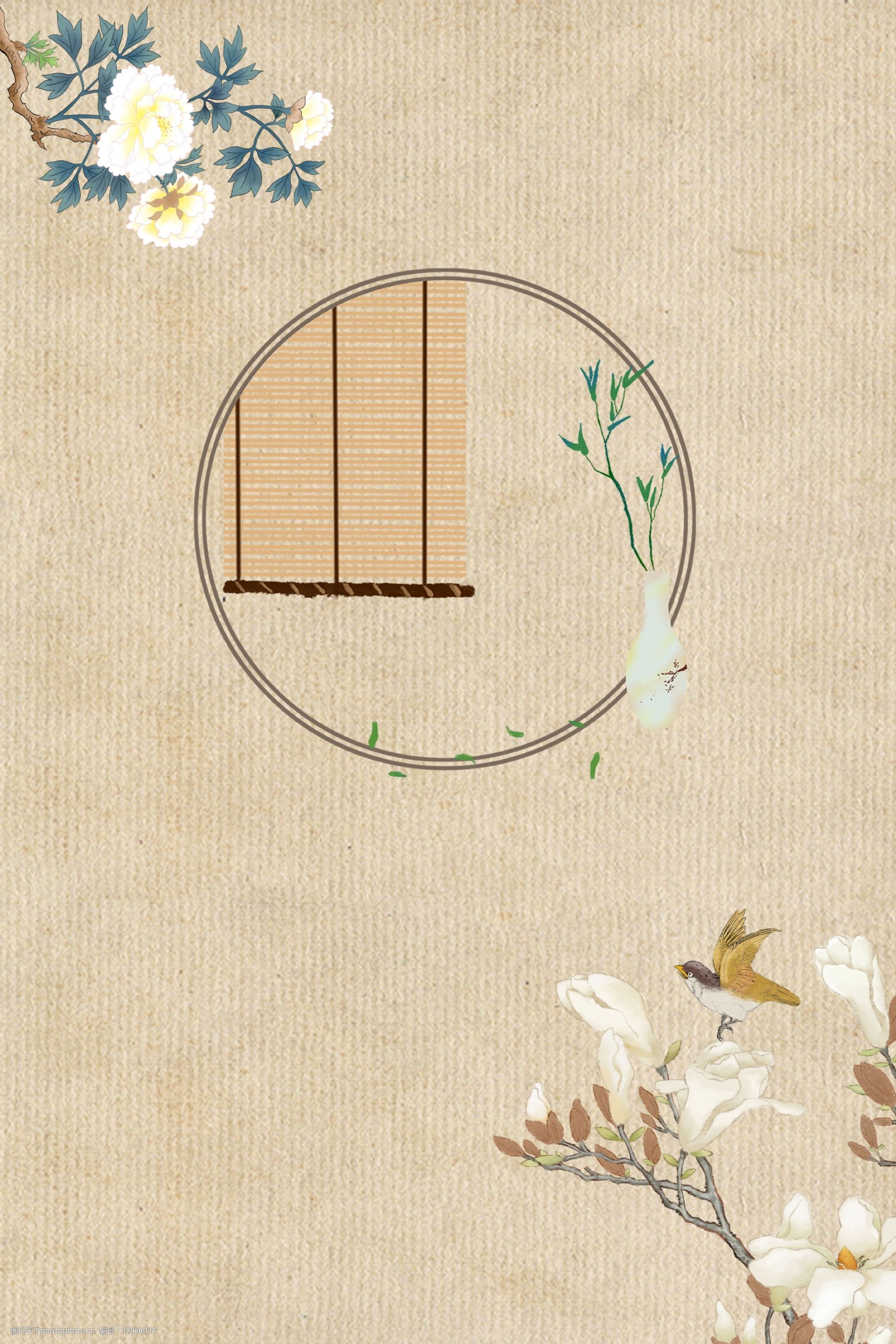 古典中国风工笔画复古花鸟花瓶卷帘海报背景