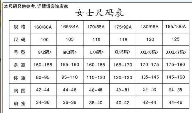 女性身高体重衣服尺码对照表