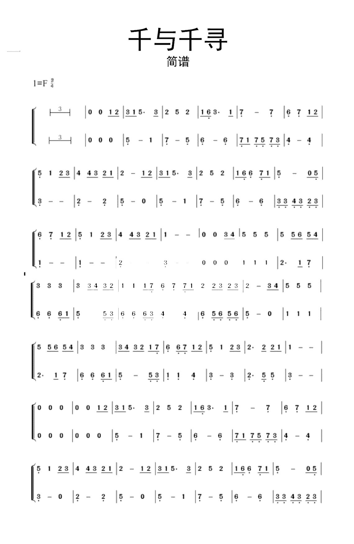《千与千寻》钢琴简谱完整版 钢琴谱/简谱 双手弹奏完整曲谱