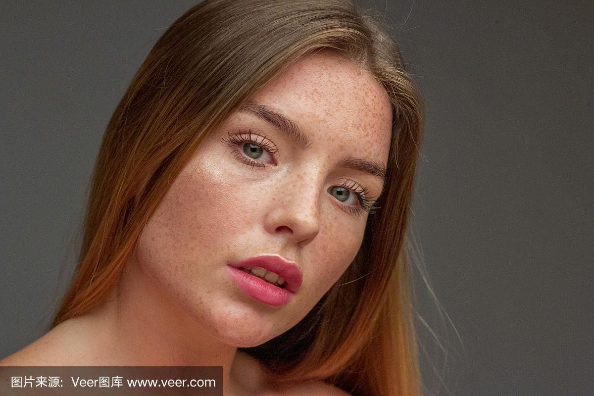 脸浅景深的一个漂亮的雀斑女孩看相机与嘴微微张开的特写