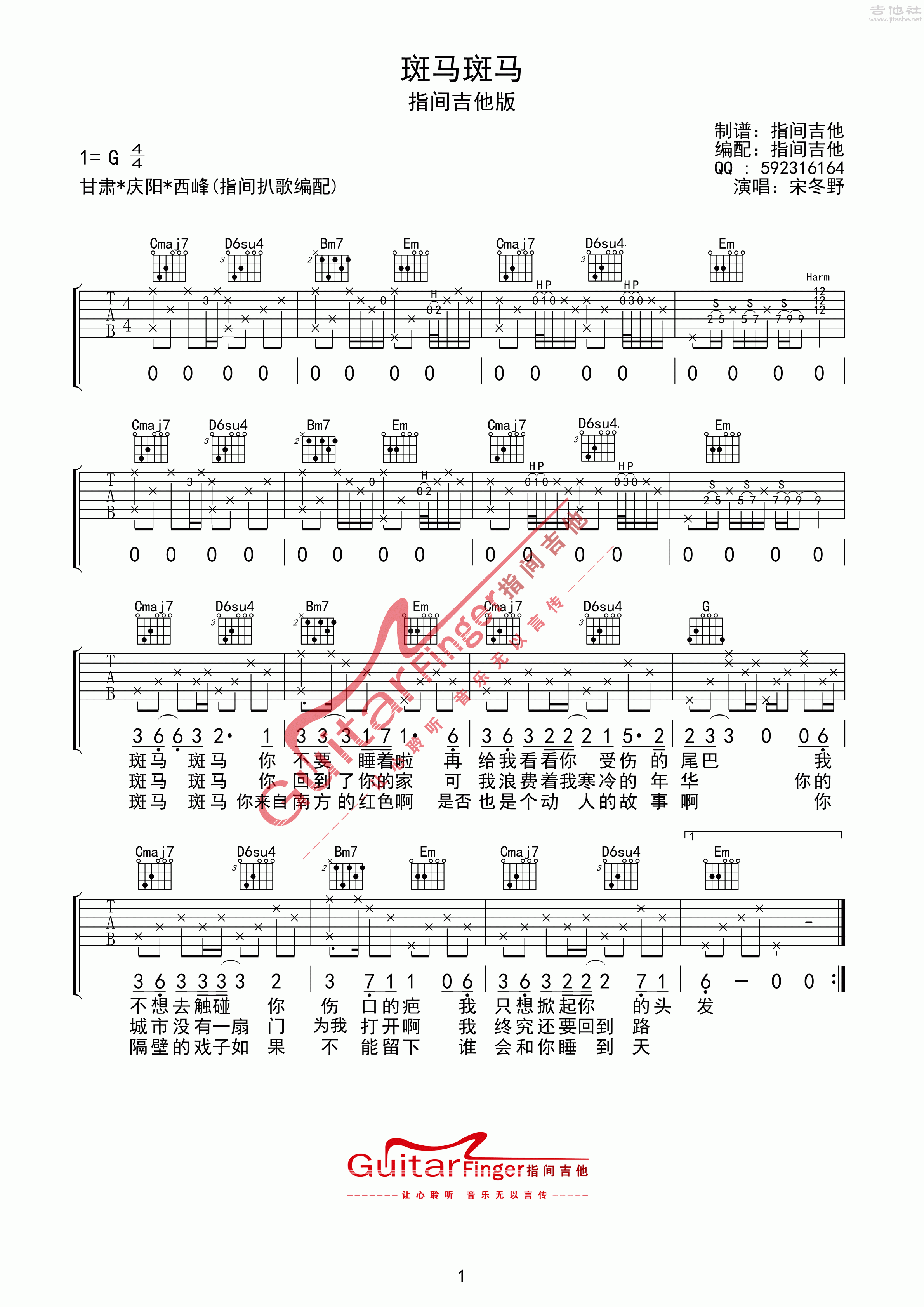 斑马斑马吉他谱-指弹谱-g调-虫虫吉他