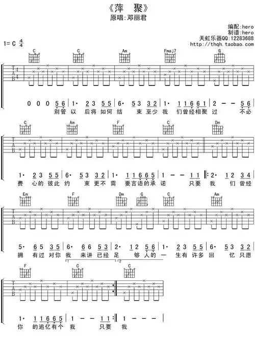 邓丽君《萍聚》吉他谱_c调超级简单和弦编配_天虹乐器新手入门练习谱