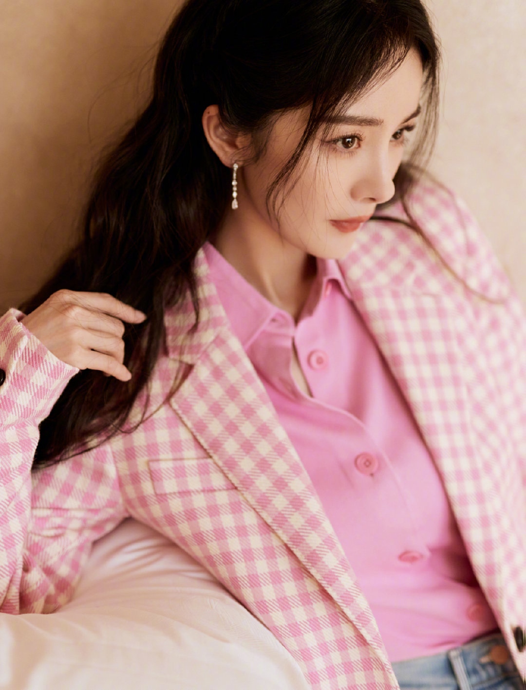杨幂# 一袭粉色格子西装配牛仔裤,脚蹬白色高跟鞋,雪肤玉貌的容颜