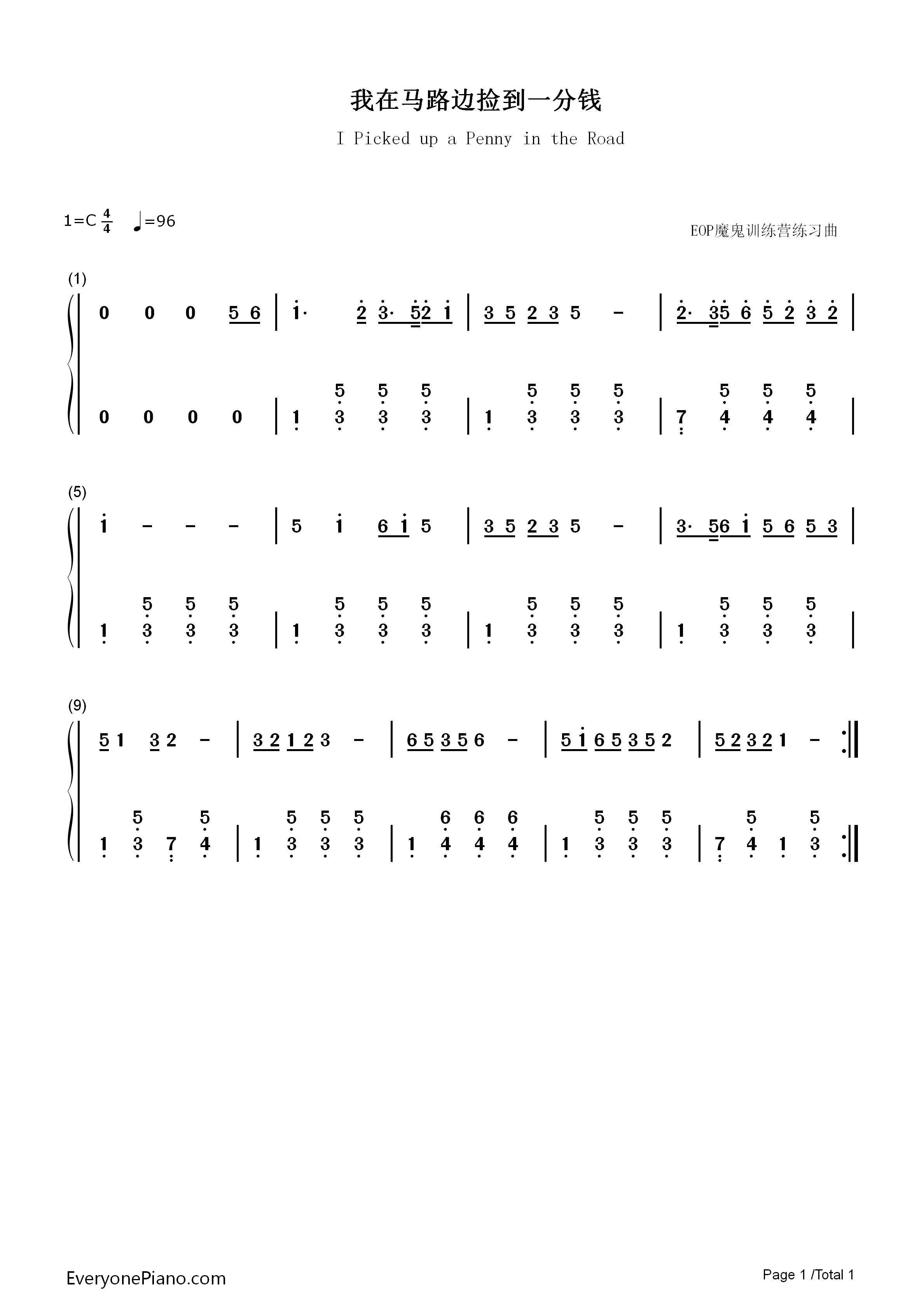 一分钱-我在马路边捡到一分钱-eop魔鬼训练营练习曲双手简谱预览1