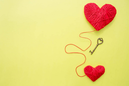 耶稣在我的心钥匙用两颗心作为爱的象征在黄的背景上.