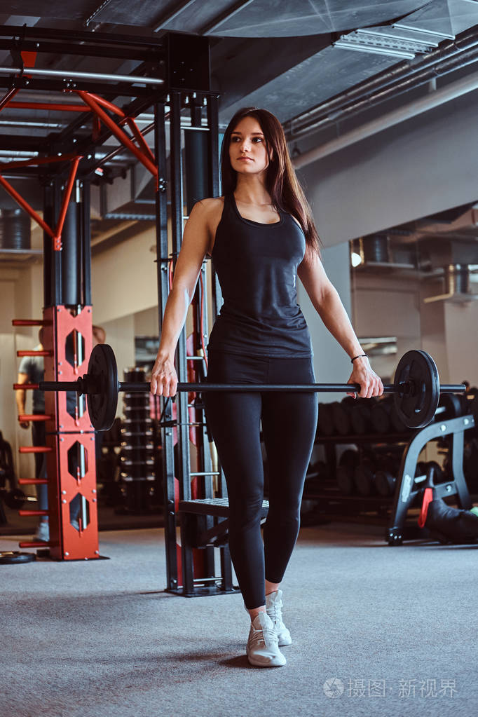 在健身俱乐部或健身房训练时, 漂亮的黑发女性在运动衫上持有杠铃照片