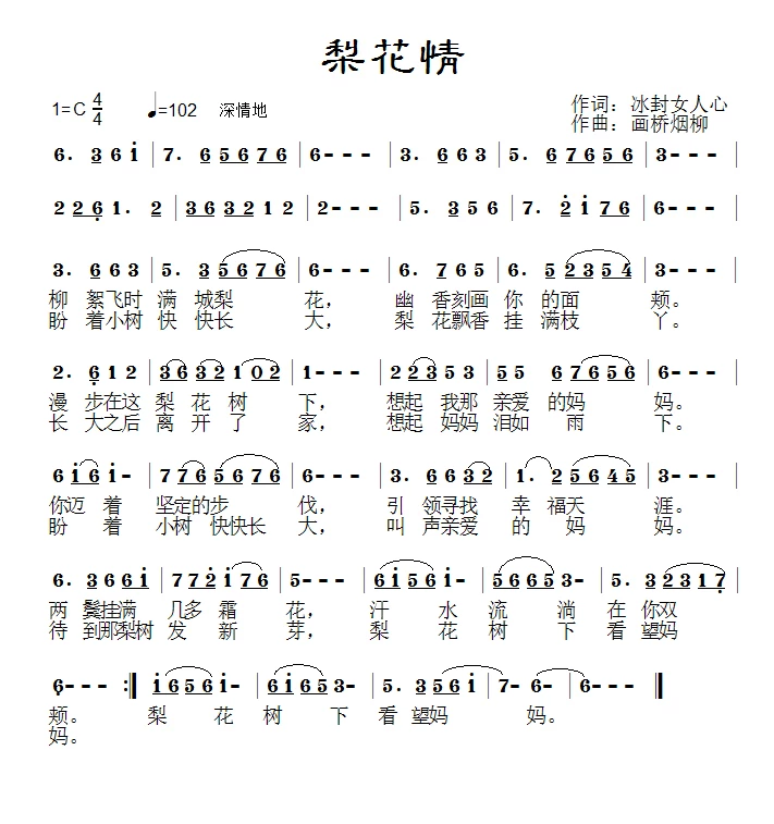 梨花飞情人泪简谱,演唱张怡诺,歌词_我爱歌谱网