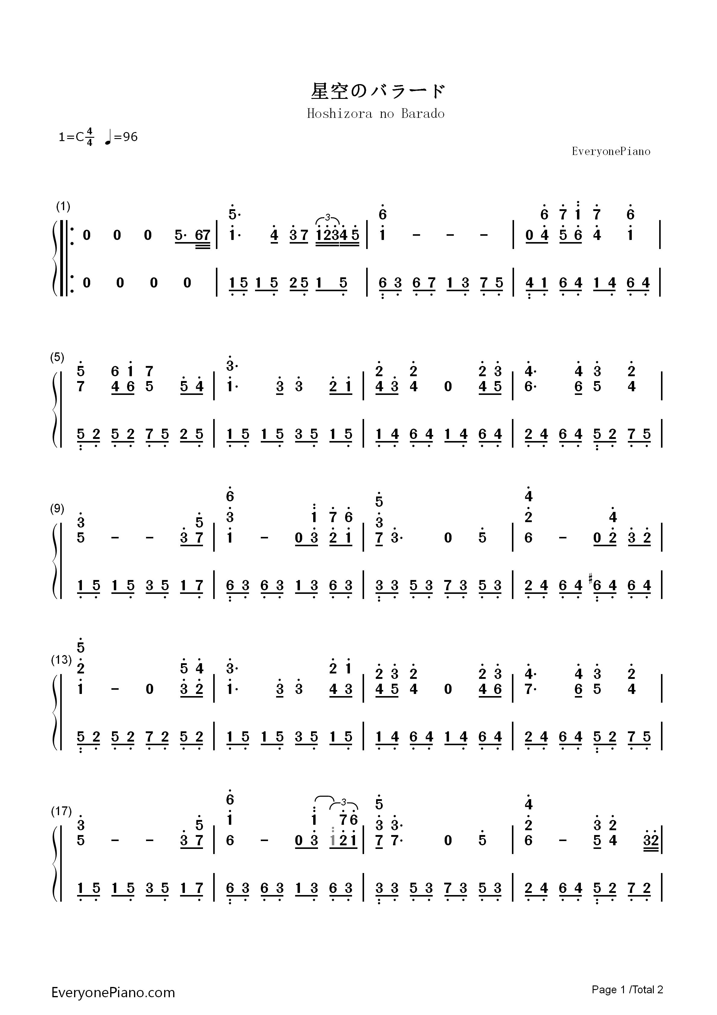 星空(理查德.克莱德曼) 初学者演奏版 钢琴双手简谱 钢琴谱 钢琴简谱