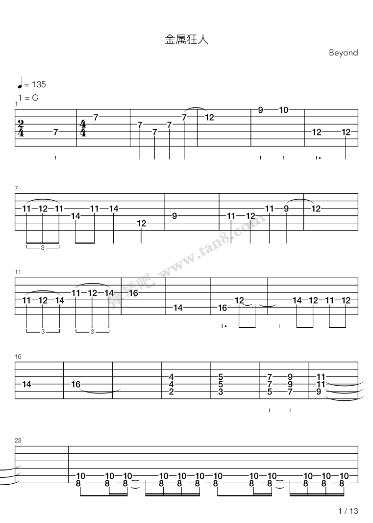金属狂人吉他谱beyond高清六线谱图片谱