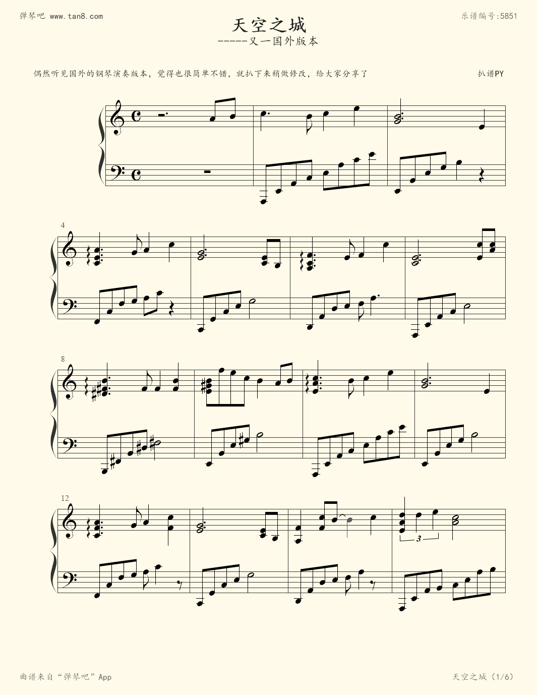 《天空之城,钢琴谱》李志(五线谱 钢琴曲 指法)-弹吧|蛐蛐钢琴网