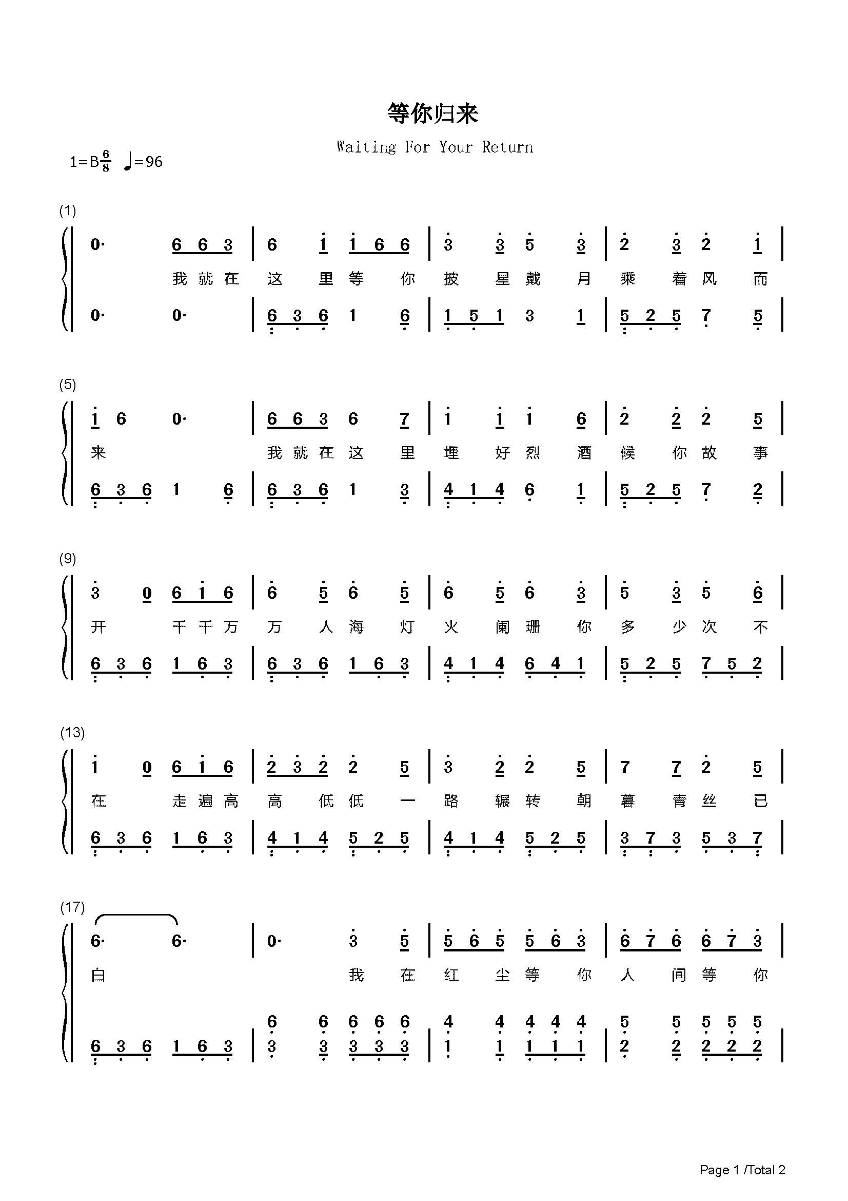 等你归来钢琴琴谱双手简谱电子版独奏程响数字乐器软件