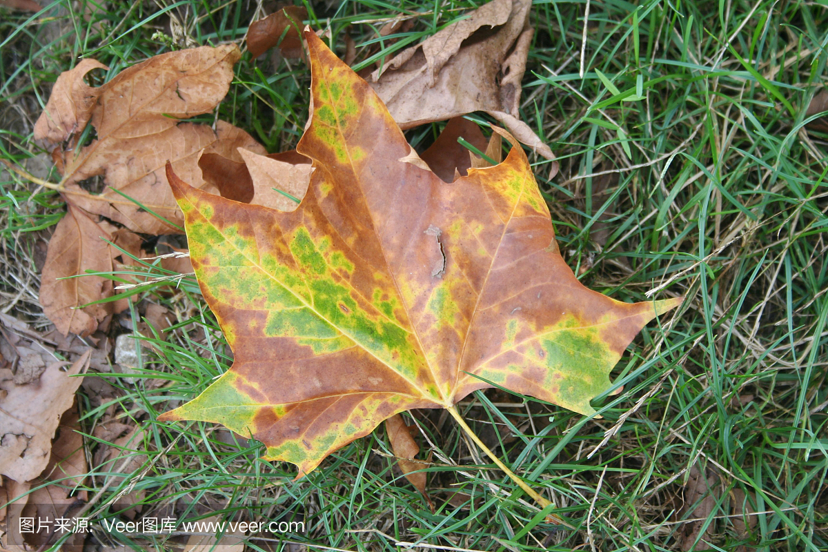 黄色,棕色和绿色梧桐树的叶子在绿色的草地上.法国梧桐occidentalis
