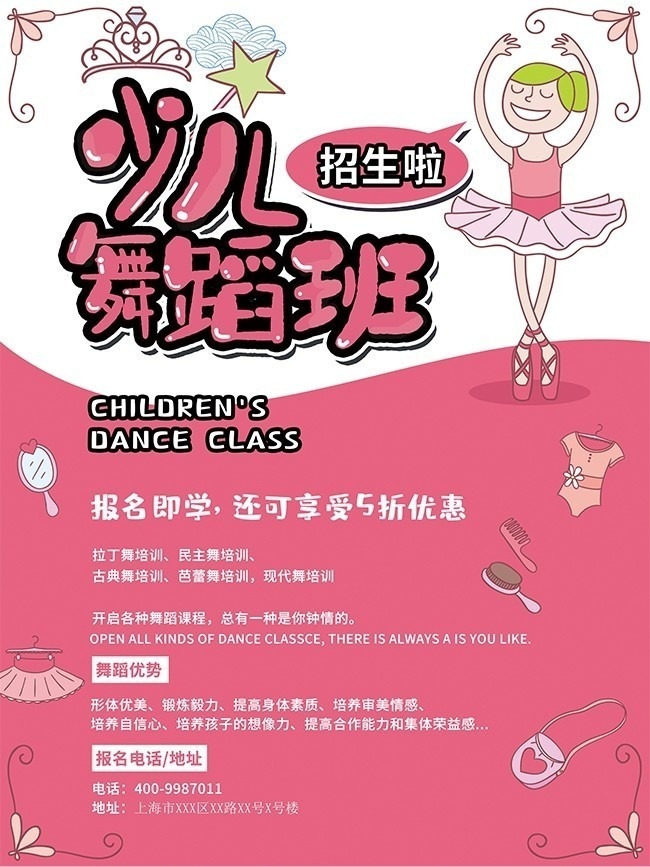 这是一张关于少儿舞蹈宣传海报设计图片,以粉色为主色调,手卡通,卡通