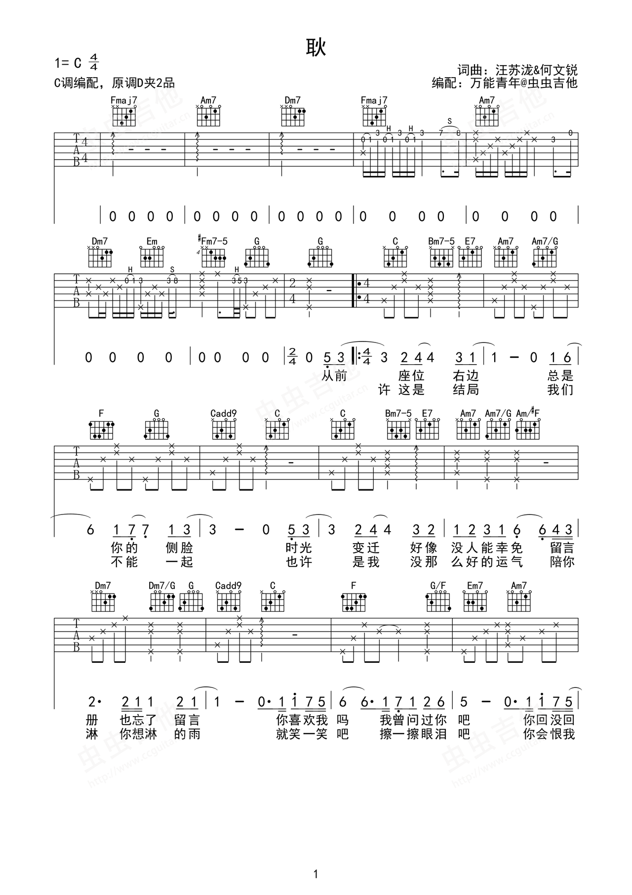 汪苏泷《耿》原版吉他弹唱六线谱钢琴谱-c调-虫虫钢琴