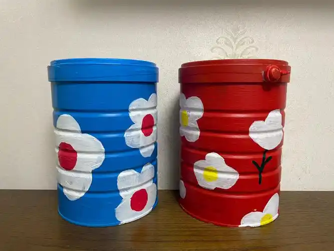 小二班的小朋友开动小脑筋,把奶粉罐当做画纸,画出了美丽的图案
