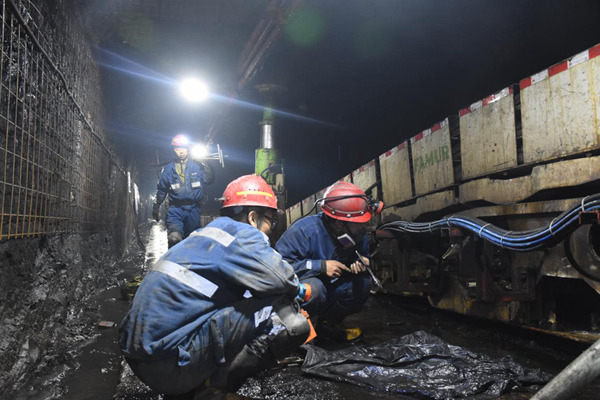 在清水营煤矿,矿工在井下800米处对巷道进行维修(2月18日摄).