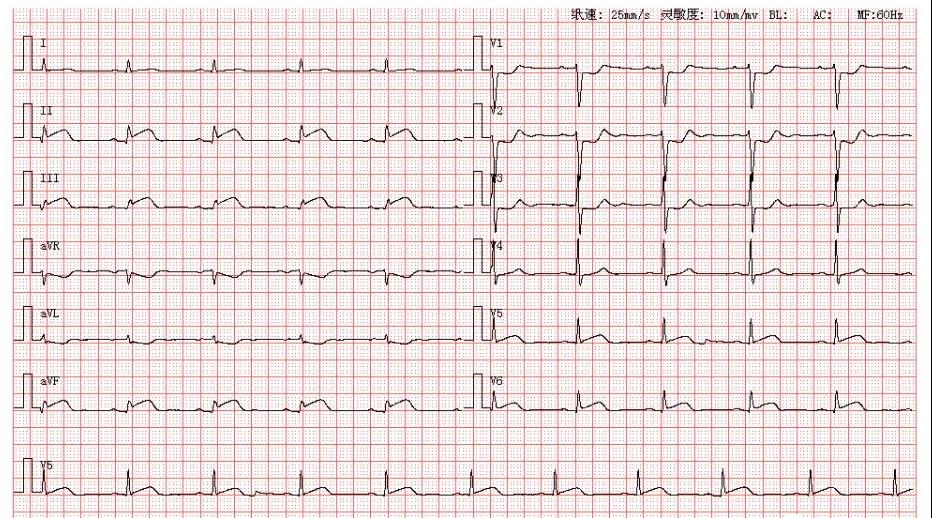 心电图示:窦性心律,急性前间壁高侧壁心肌梗死.