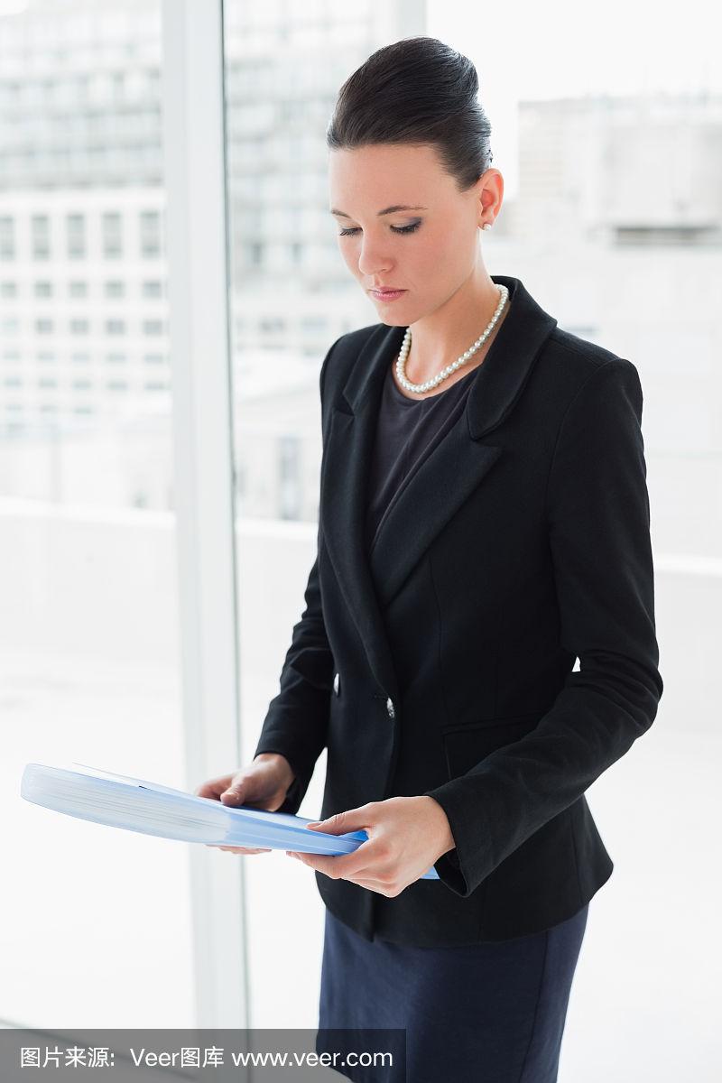 办公室,女商人,文件,墙,玻璃