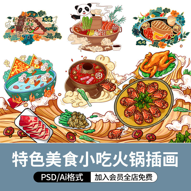 传统特色美食小吃火锅插画国潮风psd手绘食物设计素材矢量ai文件