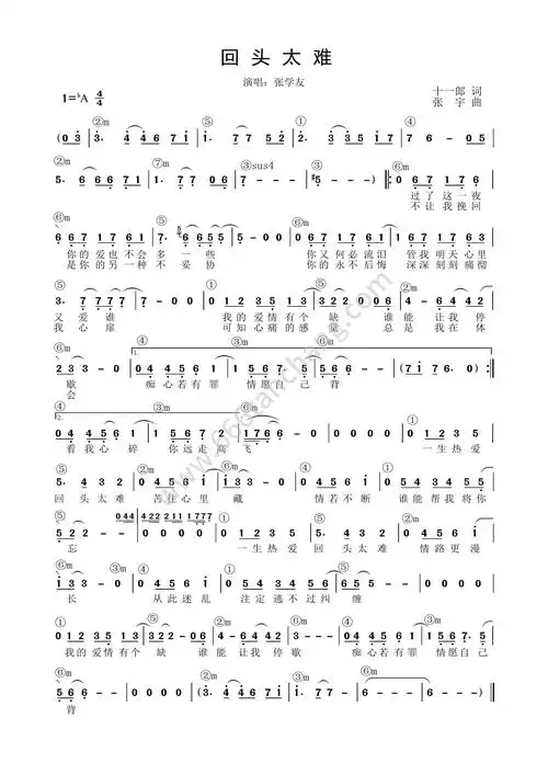 歌曲简谱张学友回头太难原版和弦谱功能谱流行弹唱网