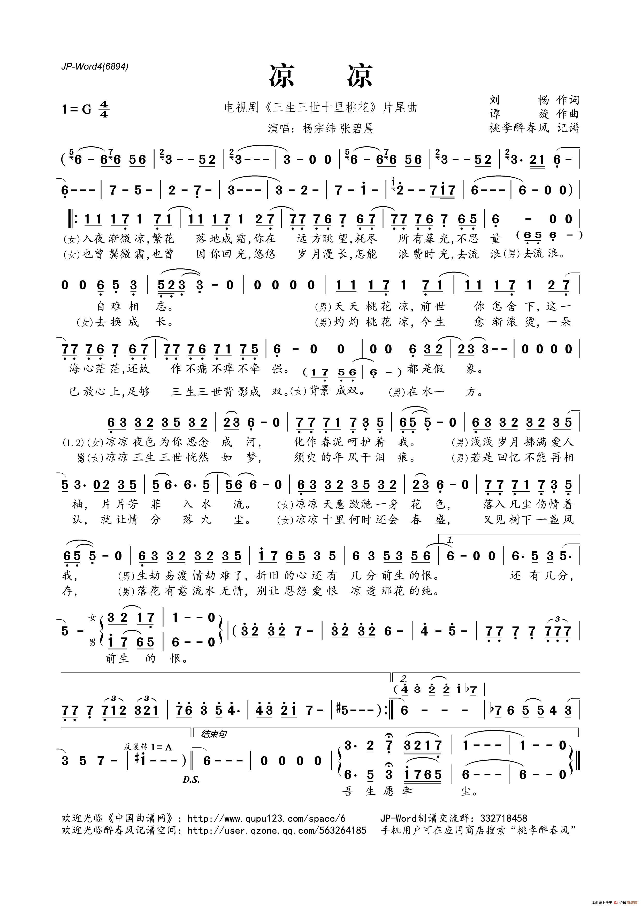 凉凉智能简谱电视剧《三生三世十里桃花》片尾曲
