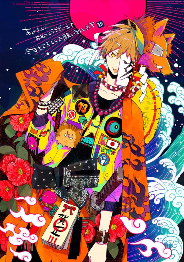 日系人物绘画,潮流前卫的卡通人物插画.花哨的武士男孩.日本画师:あさ