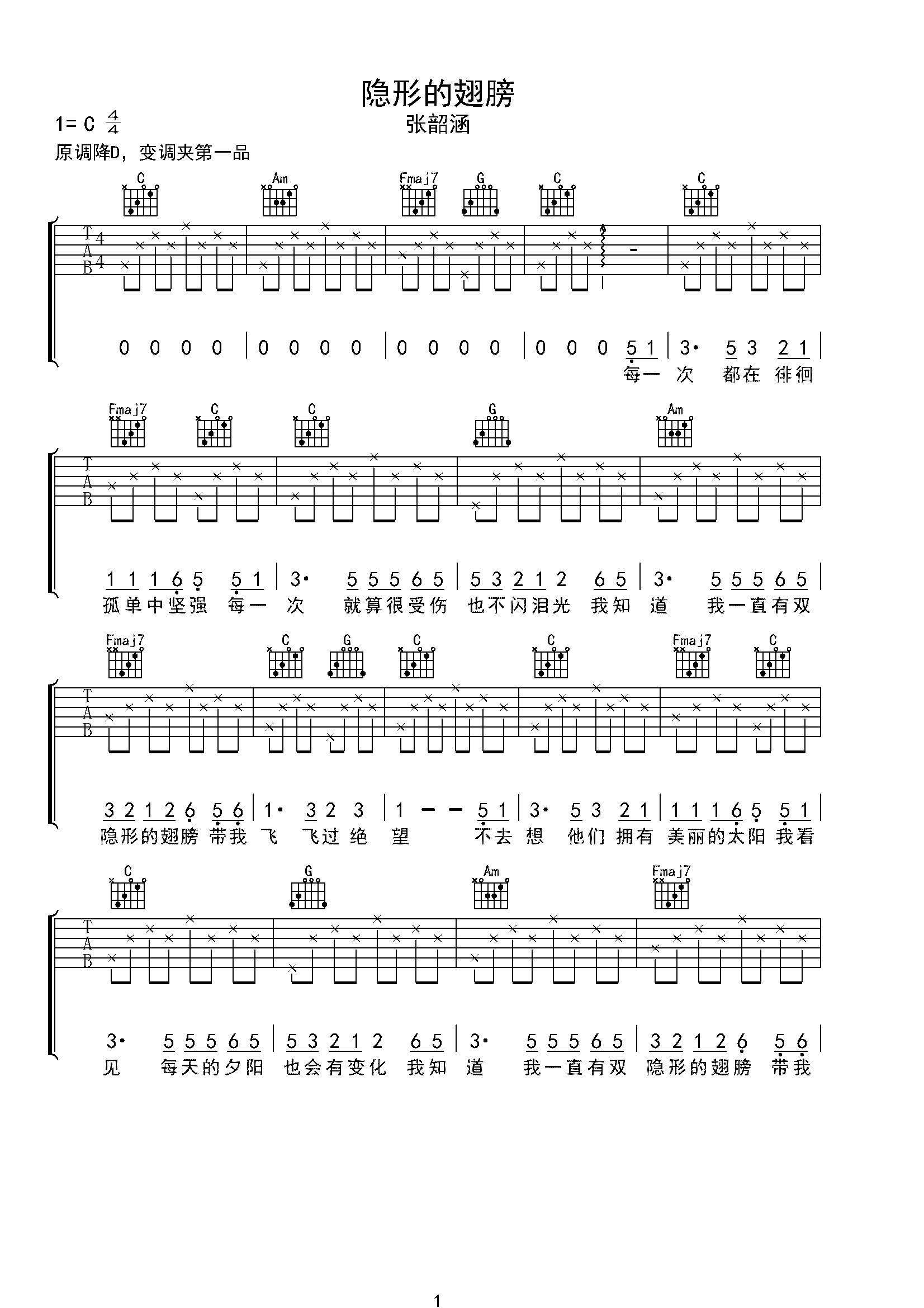 隐形的翅膀-张韶涵 c调指法编配c#调六线吉他谱-虫虫吉他谱免费下载