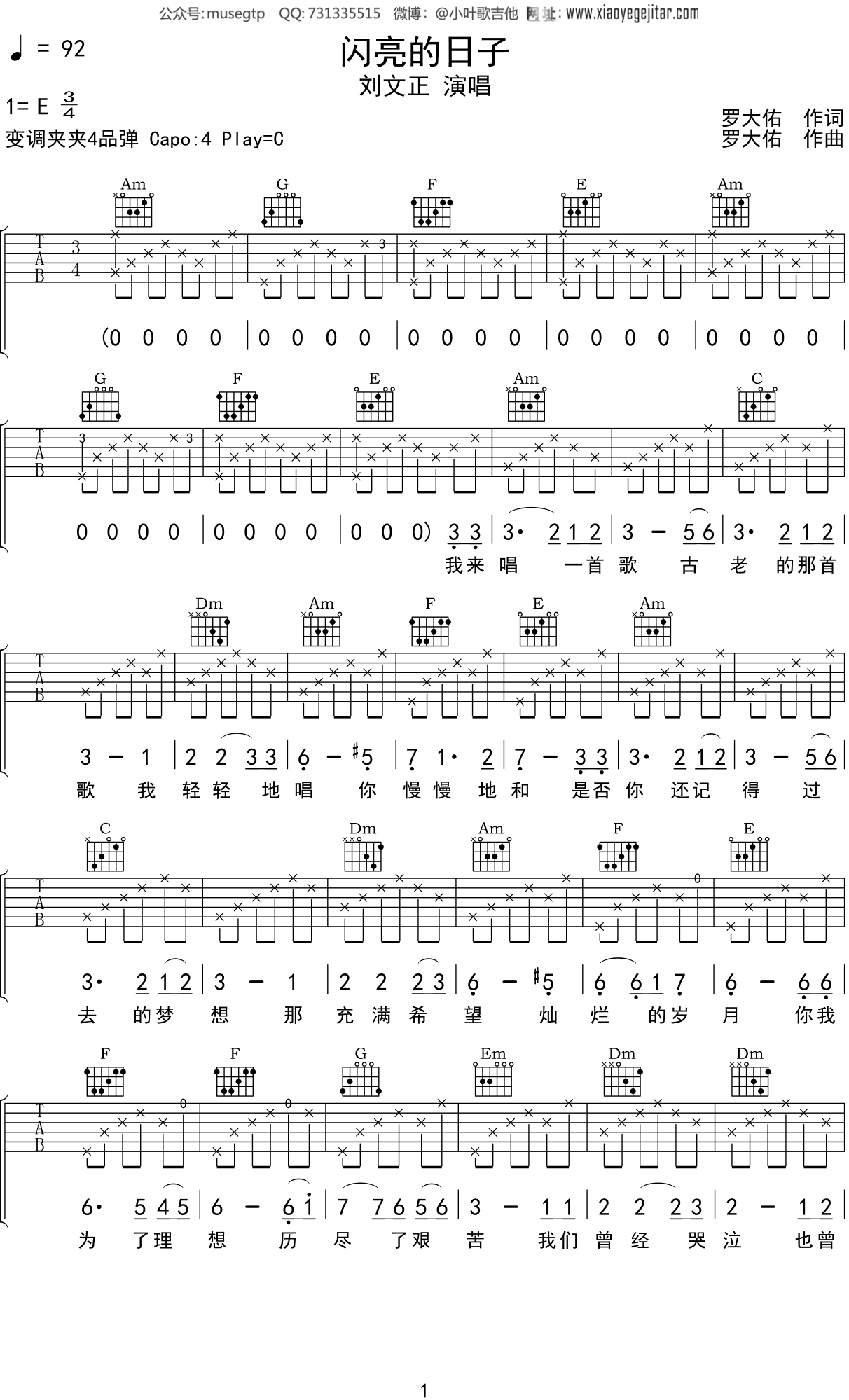 刘文正闪亮的日子吉他谱c调吉他弹唱谱