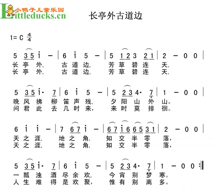 长亭外,古道边, 芳草碧连天. 晚风拂晓笛声残, 夕阳山外山.