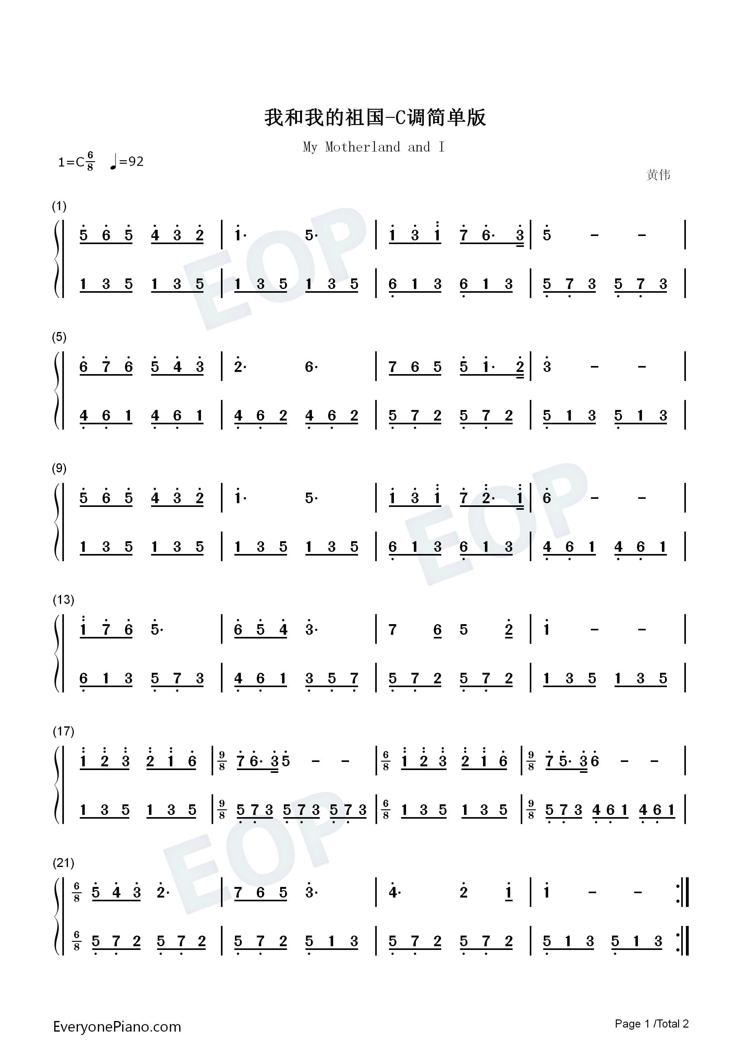 我和我的祖国-c调简单版双手简谱预览1