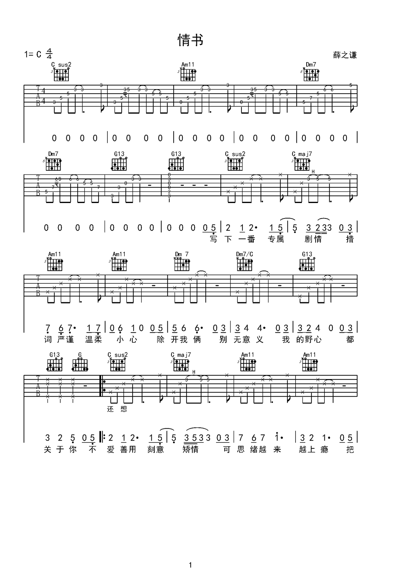 情书吉他谱c调_珺妹儿编配_薛之谦