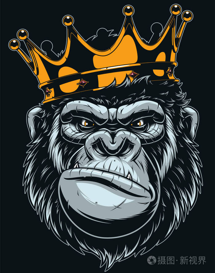 向量例证, 凶猛的大猩猩头与冠, 在黑背景