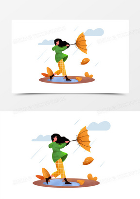 手绘卡通女孩刮大风撑不了伞元素